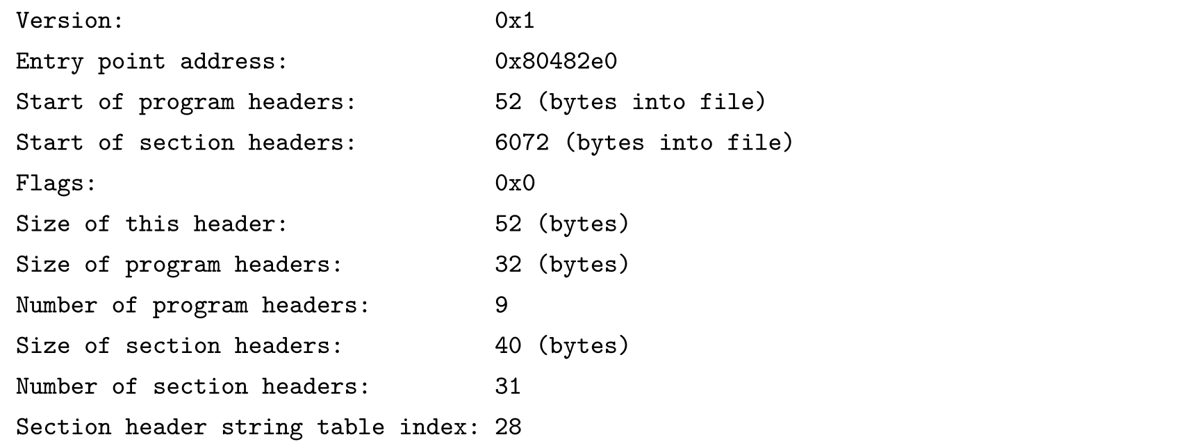 (2)Entry point address字段:也称为e_entry字段,该字段包含了可执行文件开始执行的内存地址,即系统在启动进程时对控制权进行转移的起始地址,该地址指向_start()函数。程序被装载后,装载器会查找e_entry字段,通过相关工具可以修改该字段,使其指向恶意代码地址,这样就可获取进程的执行控制权。