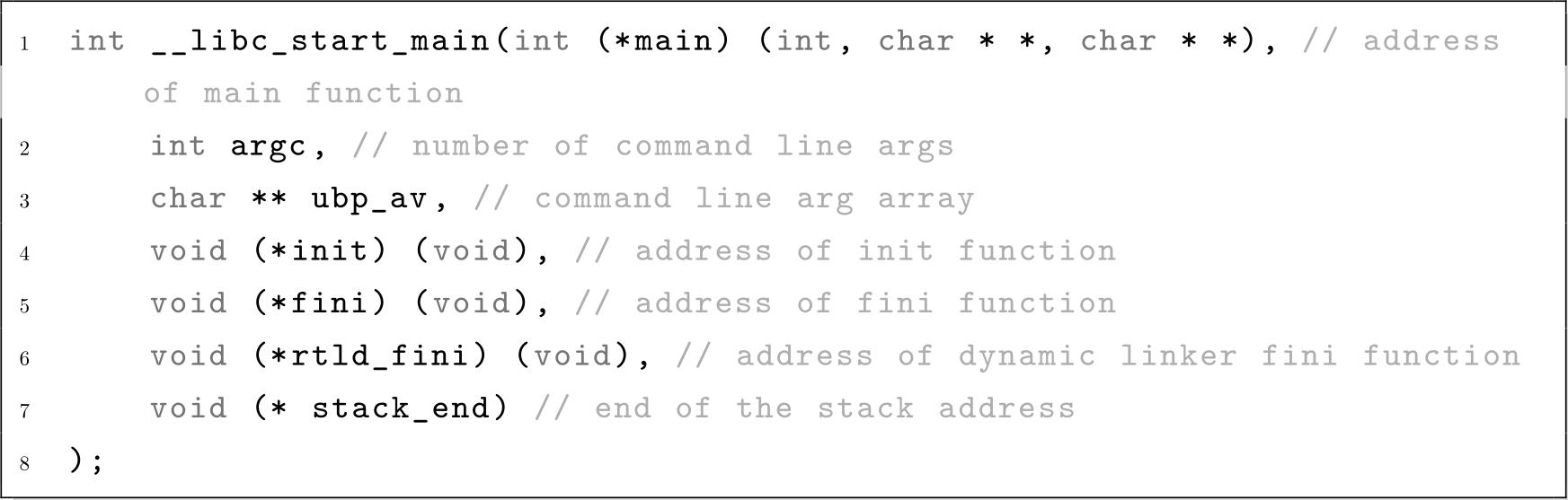 _start()函数主要功能是为_libc_start_main()函数准备相关的参数。_libc_start_main()函数的原型如下: