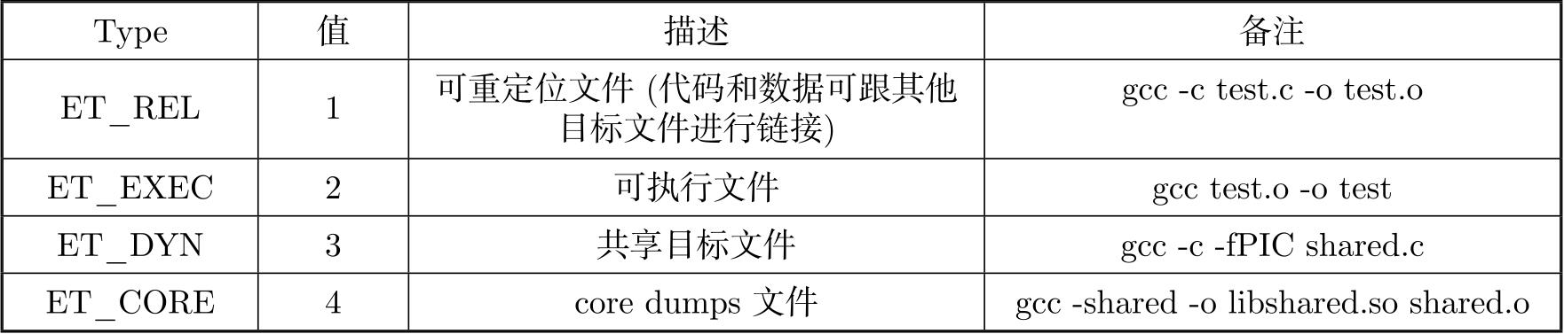 (1)Type字段。该字段用于描述ELF文件的类型,如表2.3所示。