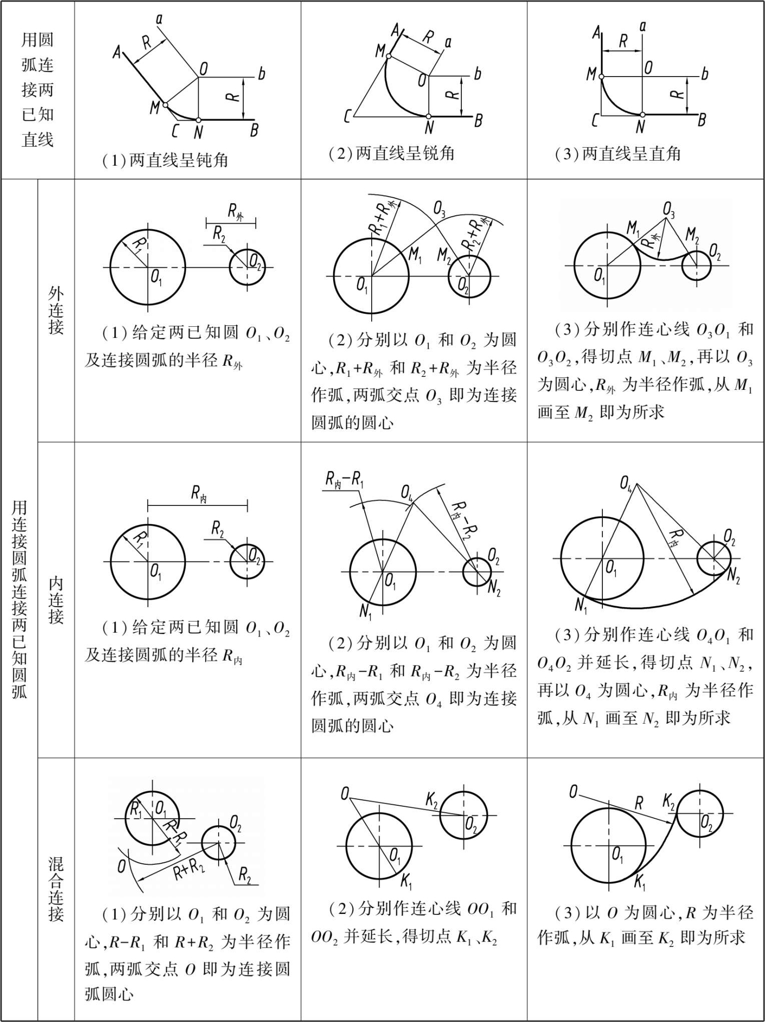 ②用连接圆弧连接两已知圆弧。其中包括: