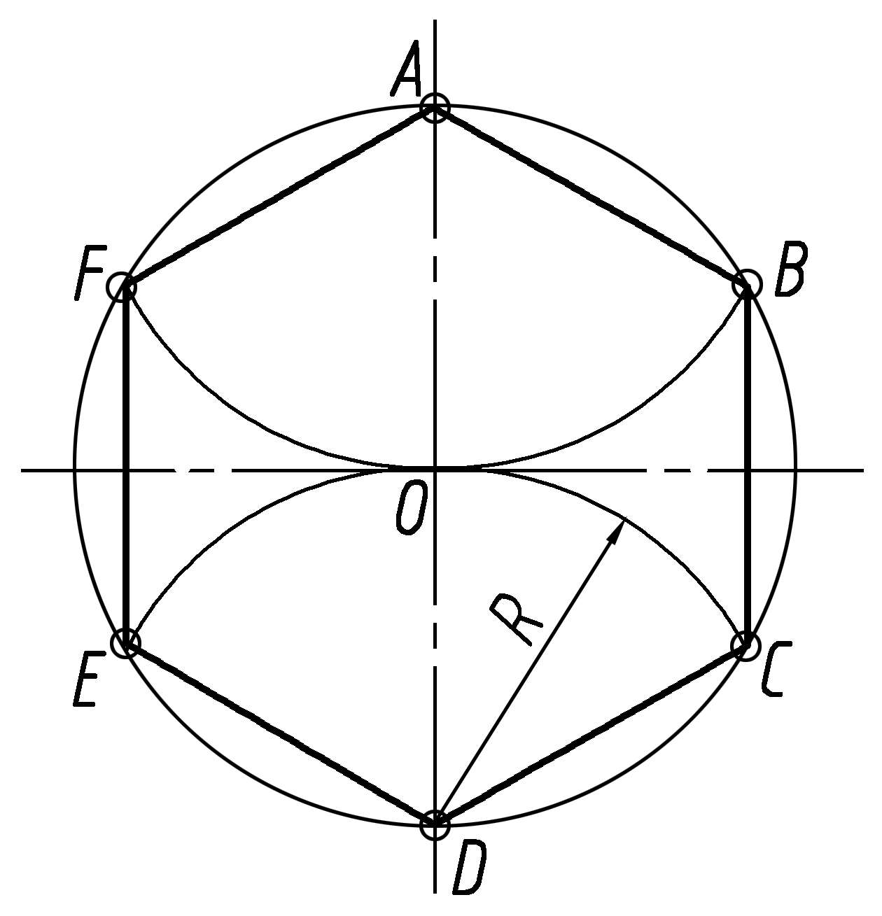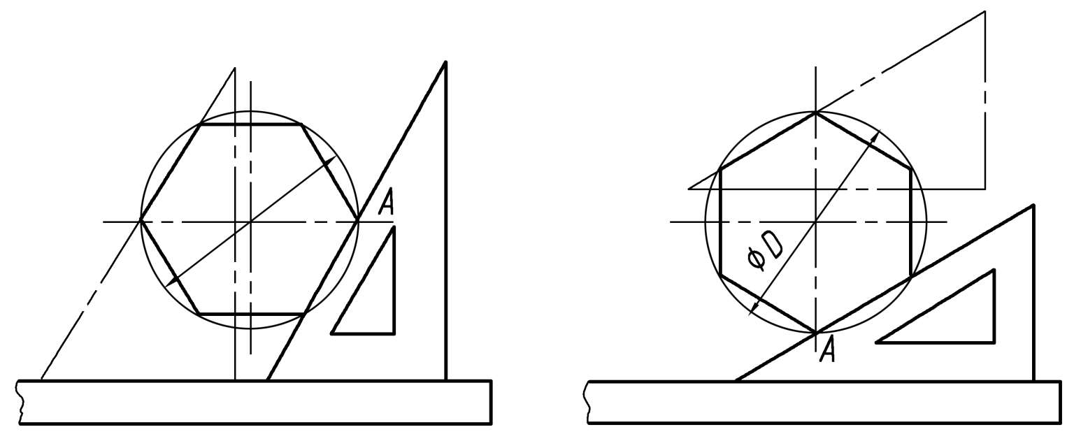 由于正六边形的对角线长度就是其外接圆的直径,且正六边形的边长就等于这个外接圆的半径,因此,以边长在外接圆上截取各顶点,即可画出正六边形,如图 1.33 所示。正六边形也可以利用 60°三角板配合丁字尺作平行线,画出 4 条斜边,再以丁字尺作上、下两条水平边即可,如图 1.34 所示。