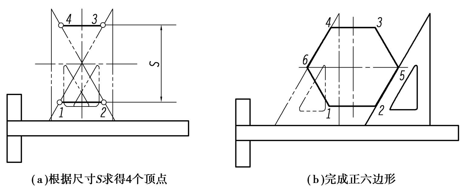 先从正六边形的中心画出对称中心线,根据对边距离S作出一对平行边,再用 60°三角板配合丁字尺,使三角板的斜边通过正六边形的中心,就可在这对对边上得到 4 个顶点,如图 1.35(a)所示,然后完成正六边形,如图 1.35(b)所示。