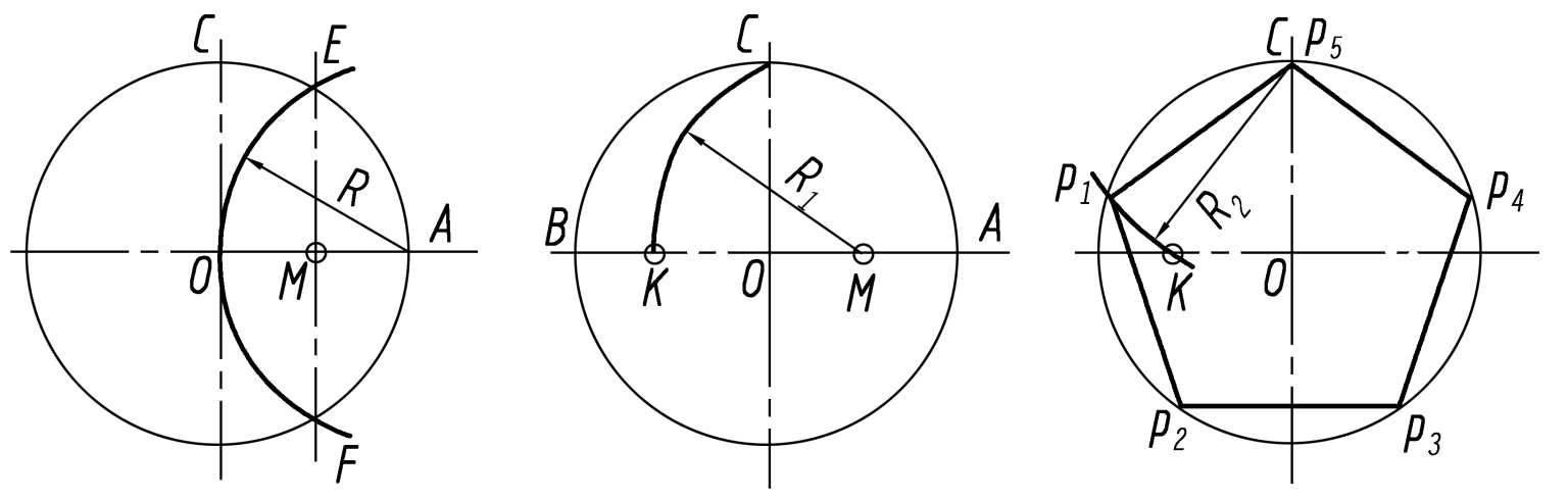 ③以CK为长自C截圆周得P 1 、P 2 、P 3 、P 4 、P 5 (C点),依次连接,即得五边形。