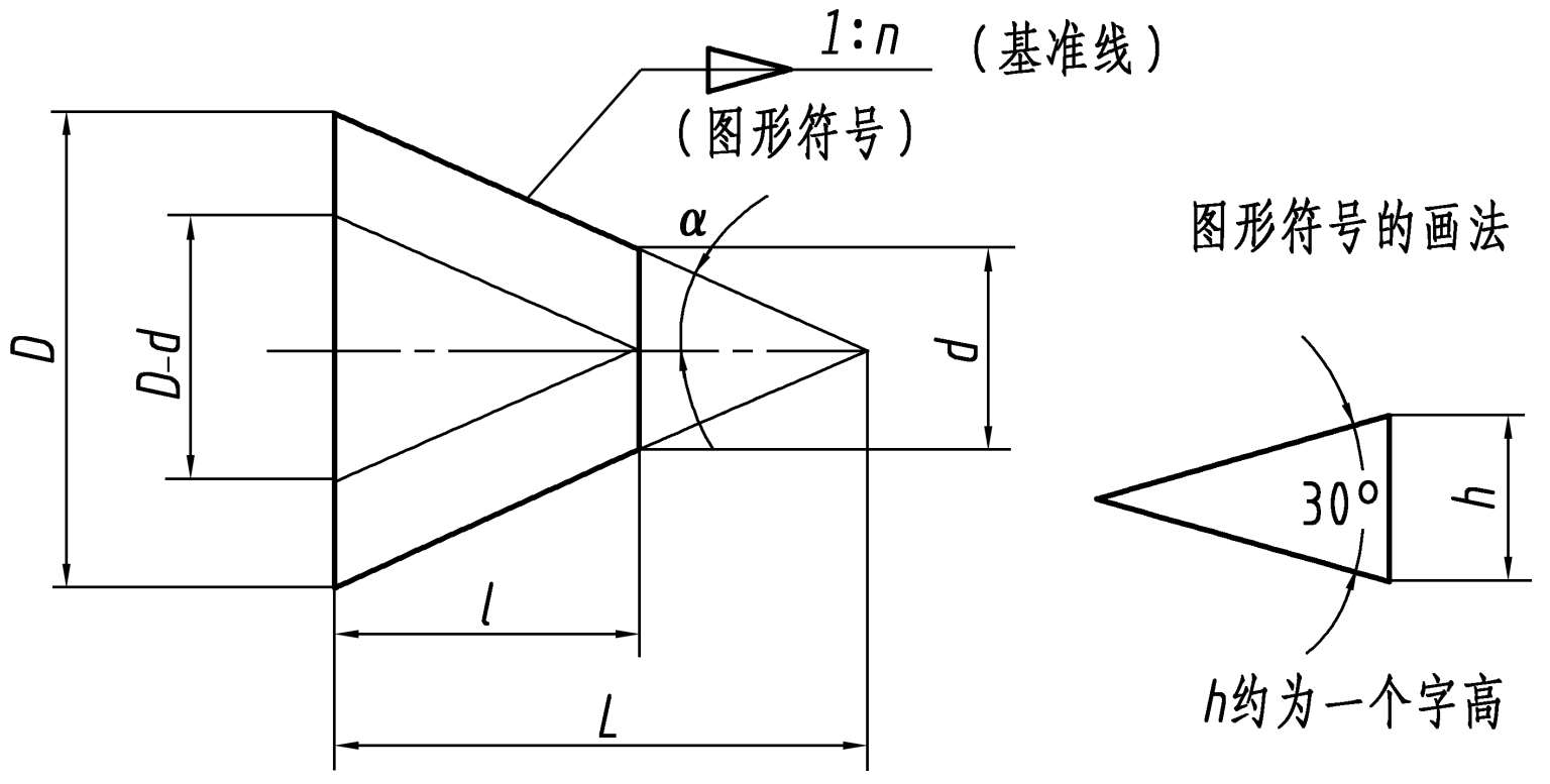 ”的后面。该符号配置在基准线(与圆锥轴线平行)上,并靠近圆锥轮廓线,指引线从圆锥轮廓线引出,图形符号倾斜方向与锥度方向一致,如图 1.41 所示,符号的线宽为h /10。