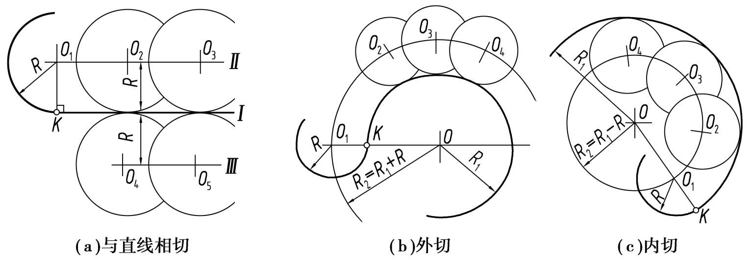 ①半径为R的圆弧与已知直线Ⅰ相切,圆心的轨迹是距离直线Ⅰ为R的两条平行线Ⅱ和Ⅲ。当圆心为O 1 时,由O 1 向直线Ⅰ所作垂线的垂足K就是切点,如图 1.43(a)所示。