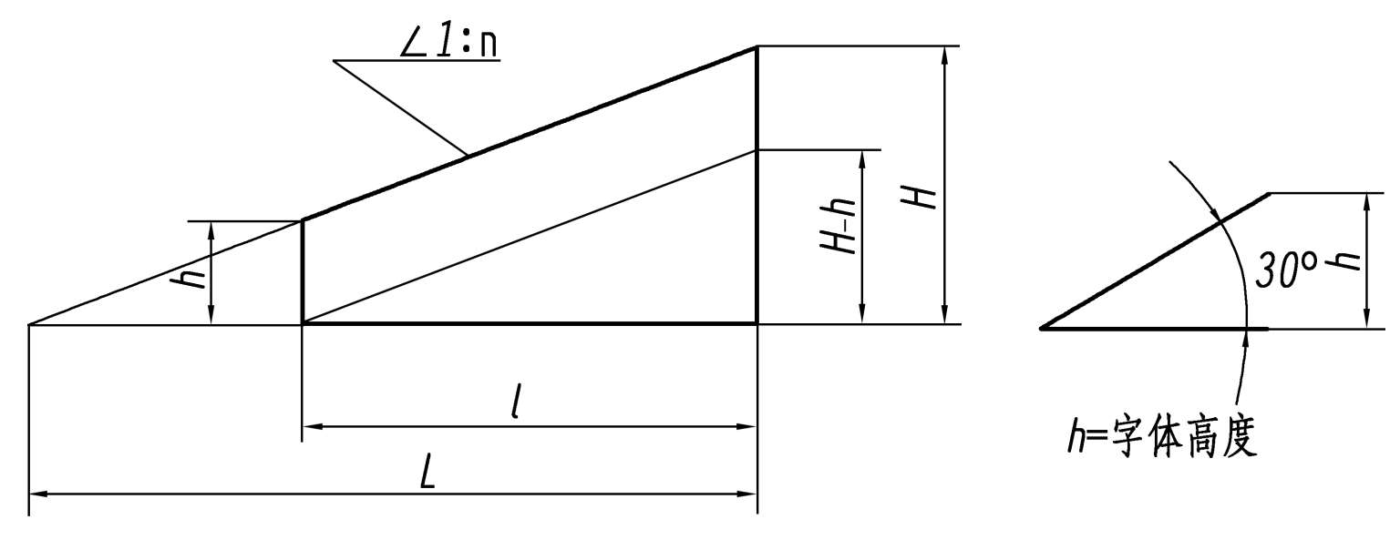 在图样上,斜度用 1 ∶n的形式标注,注写在斜度图形符号“∠”的后面;指引线从被标注的“斜线”引出,标注斜度的基准线则与参考线平行,图形符号倾斜方向应与图形的斜度方向一致,如图 1.39 所示,符号的线宽为h /10。
