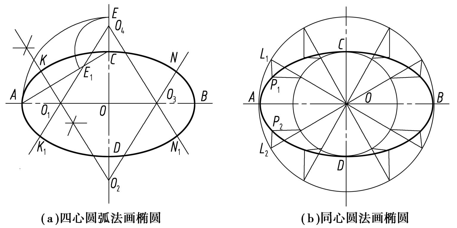 椭圆是常见的非圆曲线。已知椭圆长、短轴时,常采用四心圆弧法和同心圆法画椭圆,如图 1.38 所示。