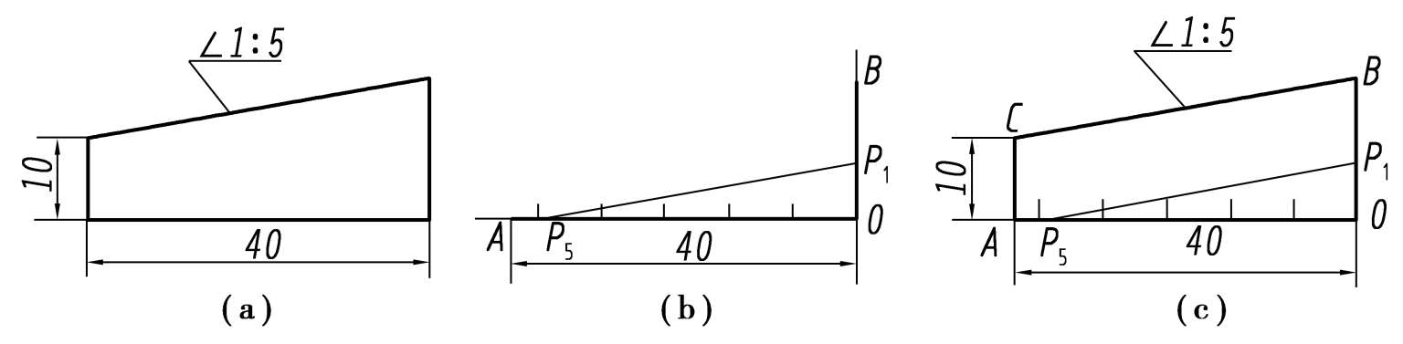 ①作OB⊥OA,在OA和OB上各取 5 个和 1 个单位长度,连接P 1 和P 5 ,即得 1 ∶5 的斜度。