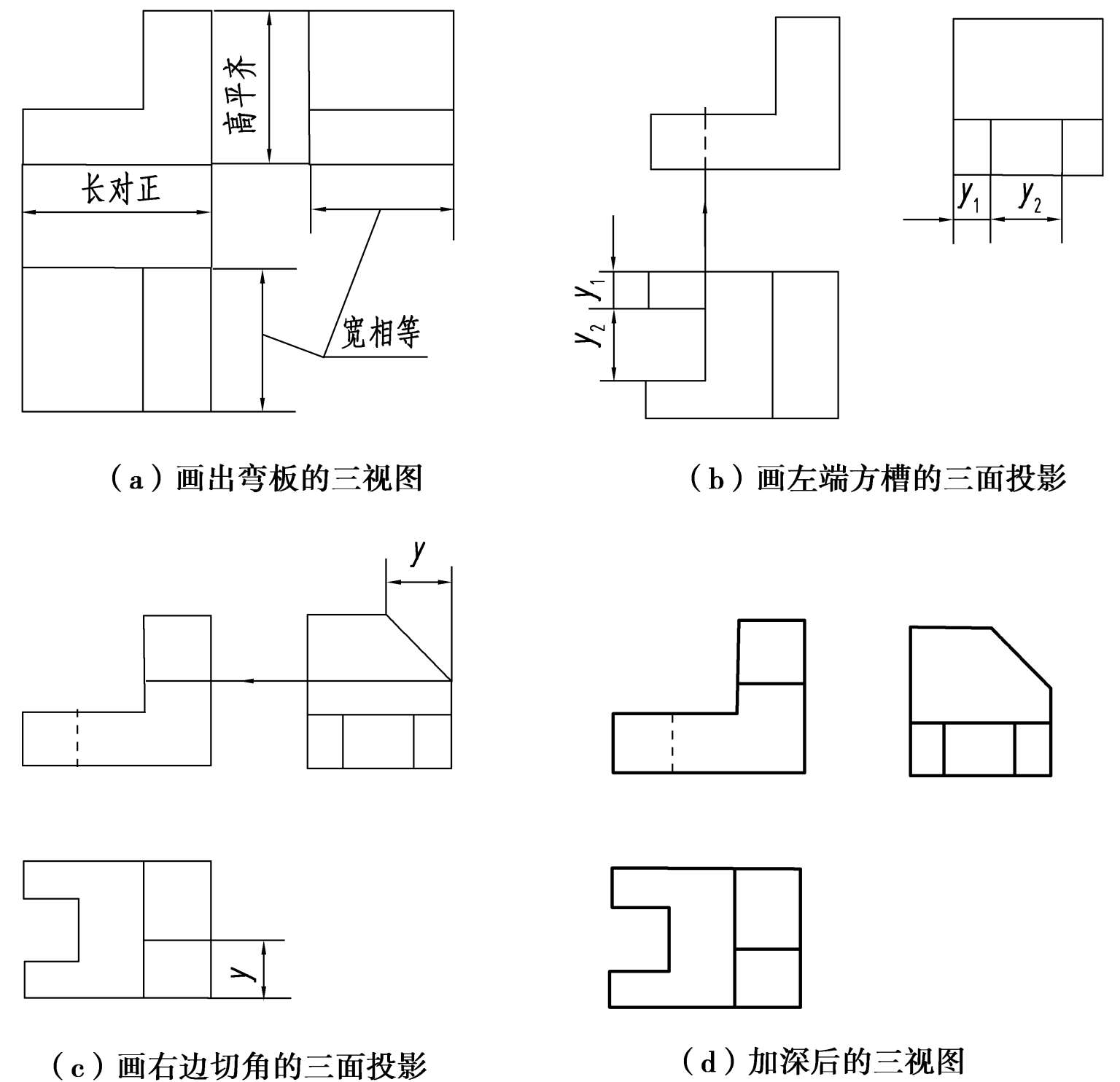 ①画出弯板的三视图,如图 2.56(a)所示。先画反映弯板形状特征的主视图,然后根据投影规律画出俯视图和左视图。