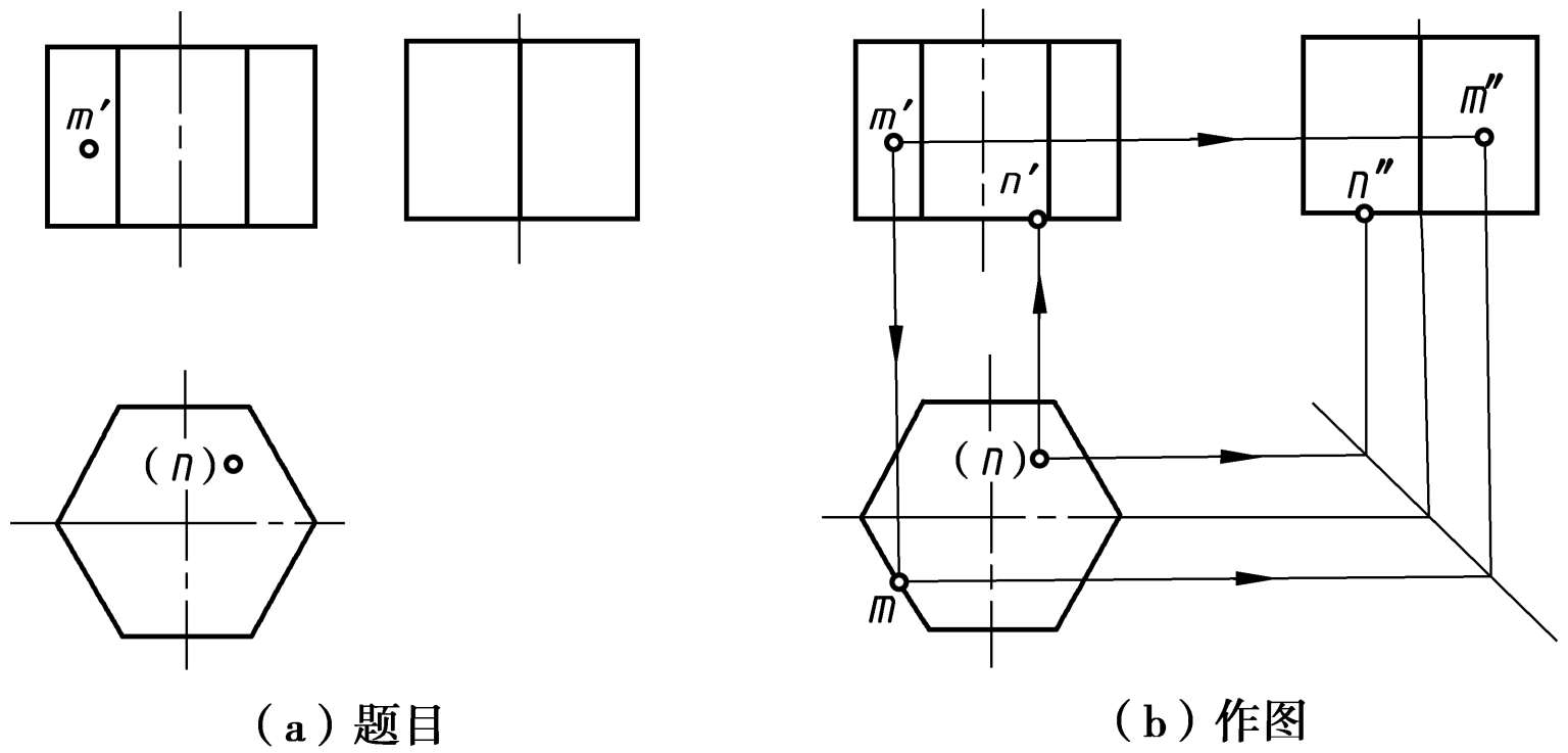 分析:由图 2.52(a)可知,由于m′可见,所以点M在六棱柱的左前棱面上,该棱面为铅垂面,其水平投影积聚为一直线,因此点M的水面投影m必在其积聚性投影上,然后再根据m′和m即可求出m″。由于点N的水平投影n不可见,因此点N在六棱柱的下底面上,其为一水平面,其正面投影、侧面投影都具有积聚性。因此,点N的正面投影n′和侧面投影n″都在底面的积聚性投影上。