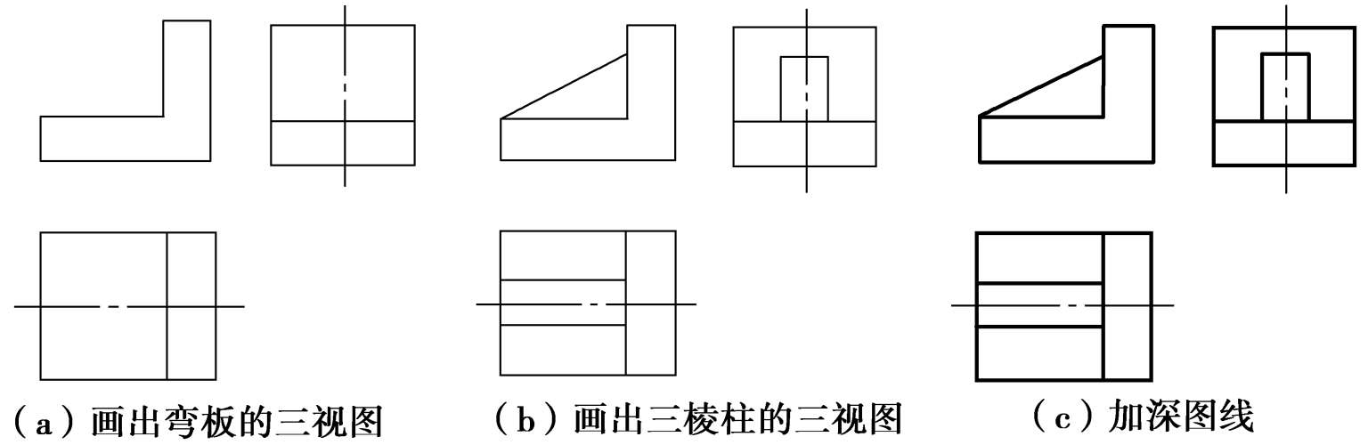 作图:叠加体的三视图通常是先大后小,分别画出每一个基本立体的三视图。这个叠加体的三视图,就是先画出弯板的三面投影,然后再画出叠加的三棱柱的三面投影,如图 2.58所示。