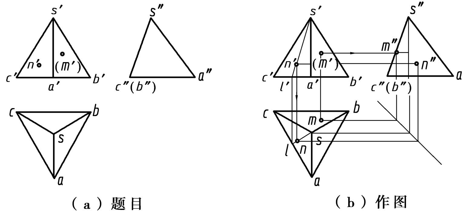 解:由于m′不可见,所以点M在棱面△SBC上,△SBC是侧垂面,因此可先求出点M的侧面投影m″,再根据m′和m″即可求出m。点N处在一般位置的棱面△SAC上,需要通过在平面上作辅助线的方法求出点N的另两个投影。