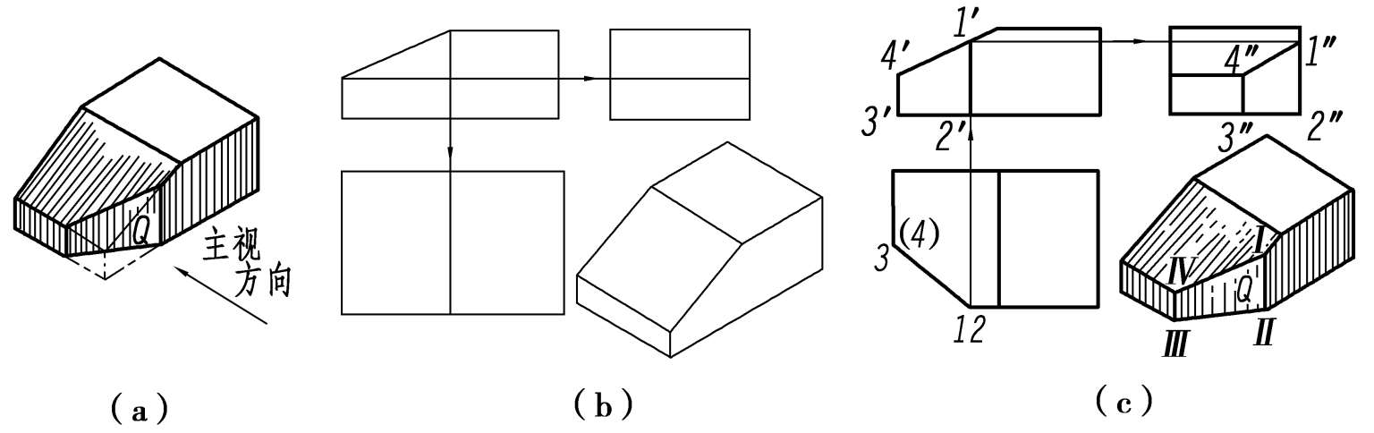 平面Q为铅垂面,它与四个相邻的平面的交线构成了四边形ⅠⅡⅢⅣ,其中Q与正平面和侧平面的交线ⅠⅡ和ⅢⅣ都是铅垂线,与水平面的交线ⅡⅢ为水平线,与正垂面的交线ⅣⅠ为一般位置直线。铅垂面Q的水平投影积聚为一直线,其余两投影为类似形。