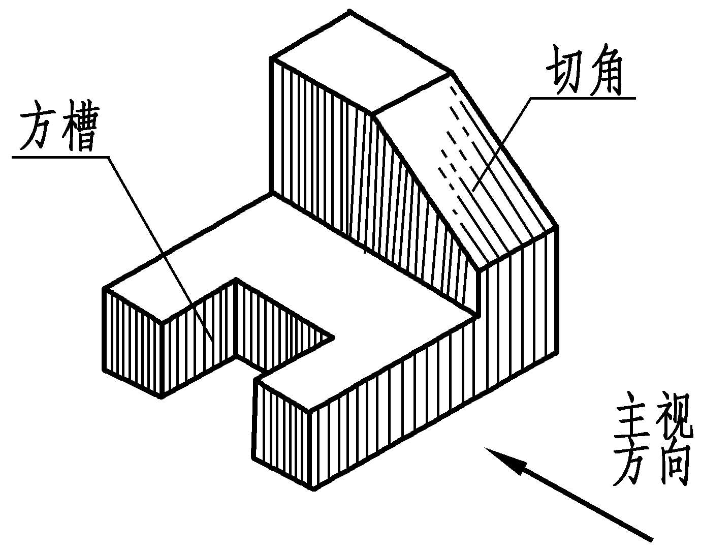 解:该立体是在L形弯板(棱柱)的左端开了一个方槽(四棱柱),右前方切去一个角(三棱柱)形成的。