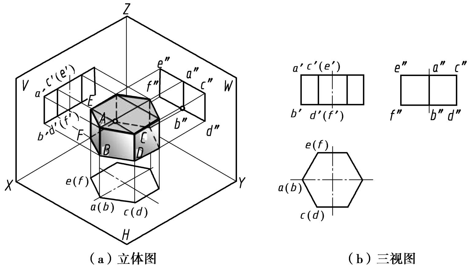 六棱柱的上下两个底面的侧面投影同样积聚为上、下两条直线。在侧面投影上,最前与最后的两条直线(c″d″和e″f″),既可以代表前后两条棱线(CD和EF)的投影,也可以代表前后两个棱面的投影。