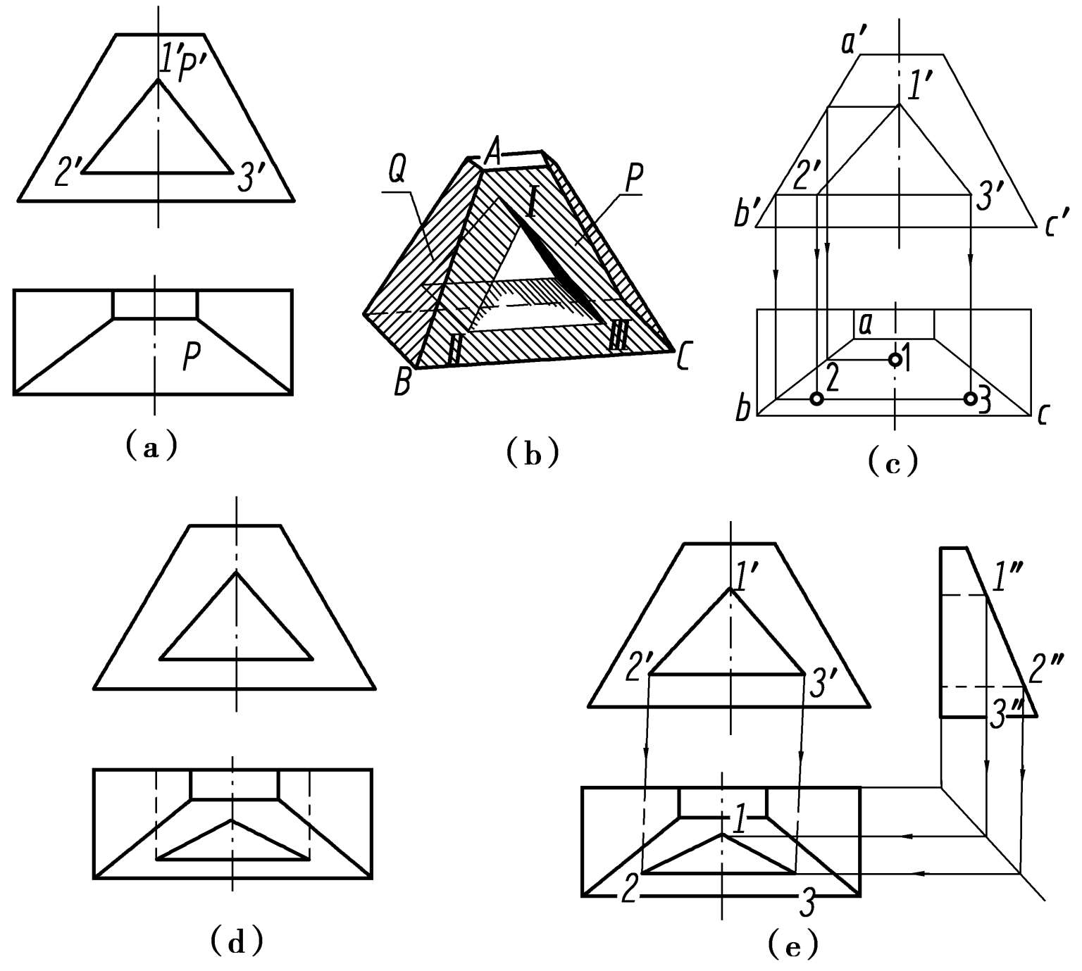 解:首先根据图 2.60(a)想象该立体的形状,如图 2.60(b)所示。可以看出:三棱柱形通孔的三个棱面与棱台的棱面P和Q分别相交成一个三角形,由于Q是正平面,因此Q面内三角形的水平投影积聚在相应的直线上,无须另画。平面P是侧垂面,它与三棱柱形通孔的三个棱面相交于△ⅠⅡⅢ,其水平投影是类似形。孔的三个棱面中,前两个是正垂面,第三个是水平面,完成俯视图就是要作出平面P内△ⅠⅡⅢ和孔的三条棱线的水平投影。