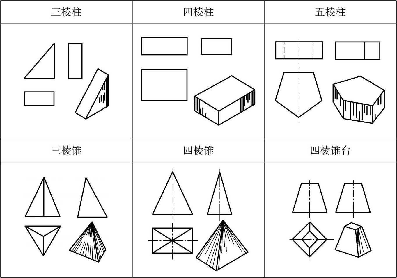 表面都是平面的立体,称为平面立体、基本平面立体有两种:棱柱和棱锥。棱柱和棱锥是由棱面和底面围成的实体,相邻两棱面的交线是棱线,棱柱的棱线互相平行,而棱锥的所有棱线汇交于一点——锥顶,底面和棱面的交线就是底面的边。以基本立体为基础,通过挖切和叠加两种方式,可以构成形状多种多样的立体。由于平面立体的各个表面都是平面图形,因此表示平面立体的关键在于画出围成立体各表面线框的投影或它们顶点的投影。