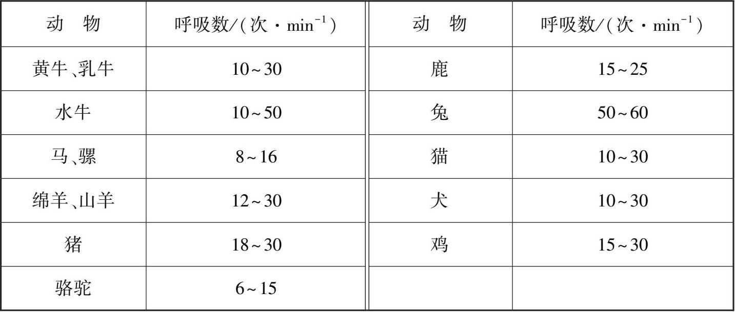 注:呼吸数的生理变动,一般幼畜比成年畜多;母畜妊娠期可增多。