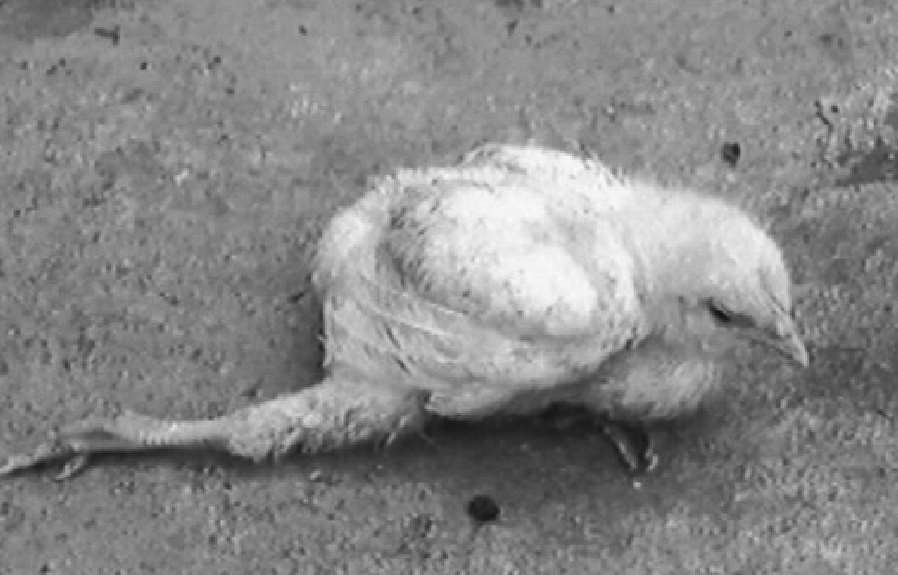 d.畜禽异常站立姿势,如牛在站立时若经常保持前躯高位、后躯低位的姿势,则提示前胃及心包的创伤性病变。当中枢有偏位的局灶性或占位性病变时,可呈头颈歪斜的姿态,如牛的脑包虫病,仔猪伪狂犬病等。鸡呈两腿前后叉开站立姿态,见于马立克氏病(图 1.45)。