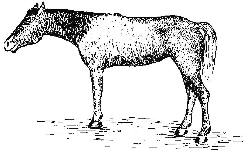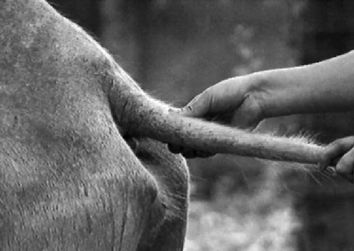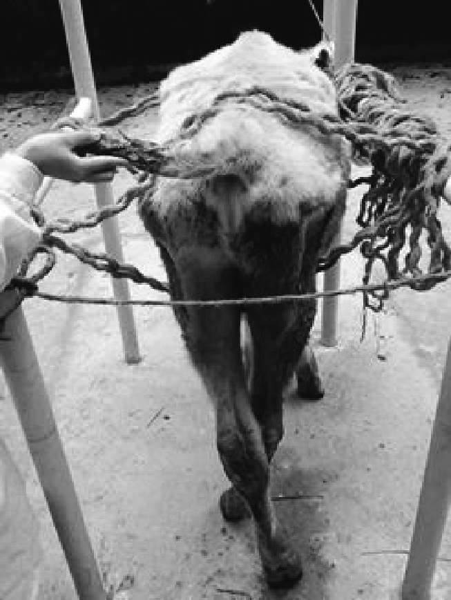 a.动物头颈平伸、肢体僵硬、四肢关节不能屈曲、尾根挺起、牙关紧闭等,呈木马样姿态。此乃破伤风的特征(图 1.43)。