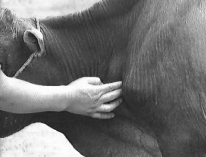 用指腹轻触脉管仔细感觉并数搏动次数(图 1.52)。如牛脉搏测定时,检查者站在牛的正后方,左手抬起牛尾,右手拇指放于牛尾根部的背面,用食指、中指在距尾根 10 cm左右处尾的腹面检查,记数并记录。