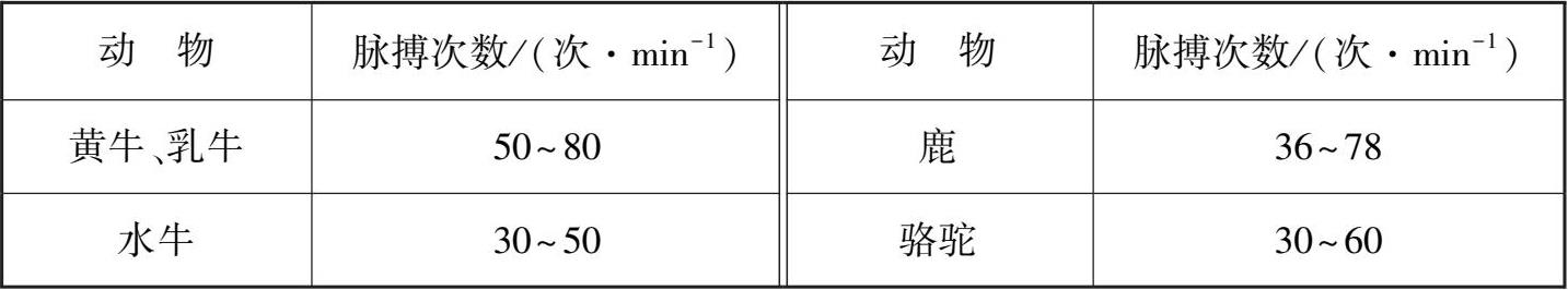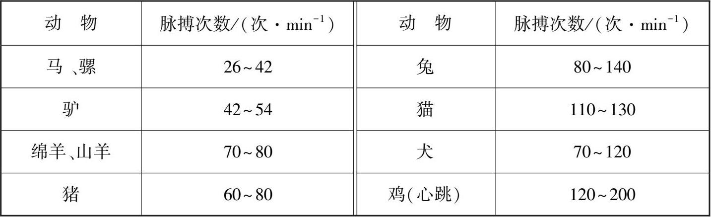 ②一般应检测 1 min;必要时可测半分钟再用半分钟的脉搏乘以 2;如动物不安静,操作时误差大,宜测2~3 min再平均。
