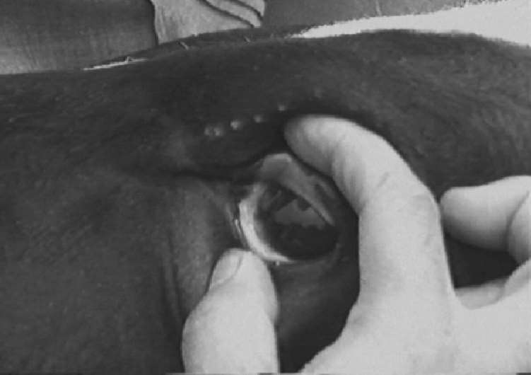 检查马的眼结膜时,检查者立于马头一侧,一只手持缰绳,另一只手食指第一指节置于上眼睑中央的边缘处,拇指放于下眼睑,其余三指屈曲并放于眼眶上面作为支点,食指向眼窝略加压力,拇指则同时拨开下眼睑,即可使结膜露出而检视之。
