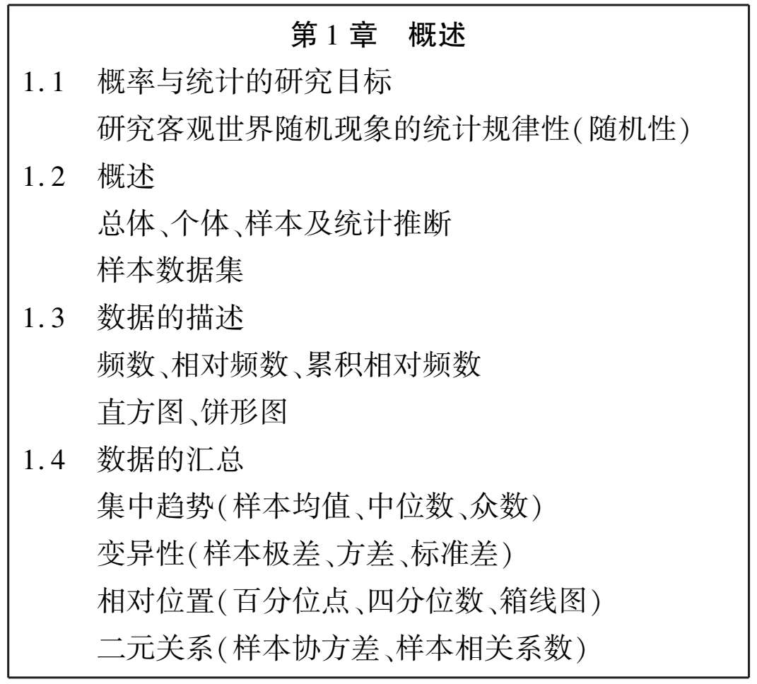 为研究随机现象的统计规律性,我们将研究对象全部元素构成的集合称为总体,从总体中抽取一个子集构成样本.有效地收集、整理样本数据集,并对样本数据集进行分析研究,从而推断出总体的性质、特点和统计规律性,这就是统计分析的目的.统计分析涉及两个不同的阶段——描述统计和推断统计,其中推断统计主要建立在概率论的基础上.