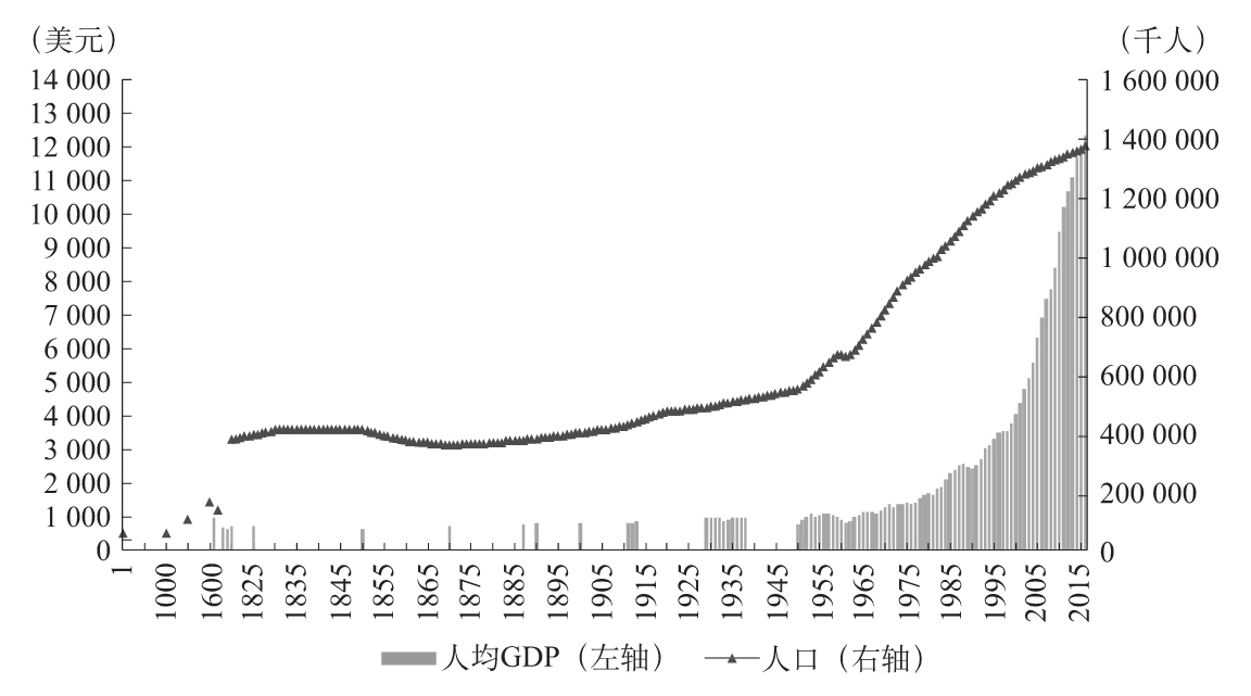 图1-1 中国人口与人均国内生产总值(GDP)增长(1—2016年)
