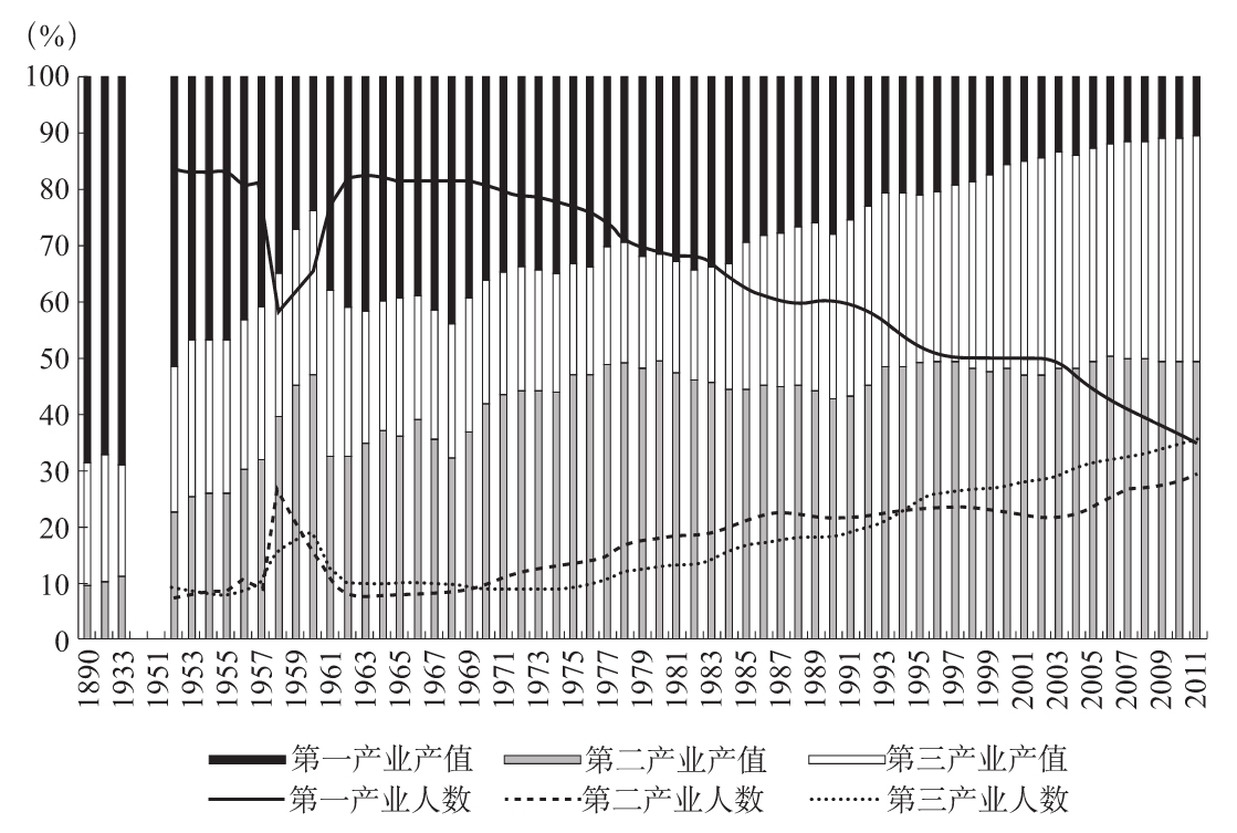 资料来源:The GGDC 10-Sector Database;Timmer,M.P.,de Vries,G.J.,& de Vries,K.(2015).“Patterns of Structural Change in Developing Countries,”In J.Weiss & M.Tribe(2016), Routledge Handbook of Industry and Development, Routledge 6583;此外,1890年、1913年、1933年数据来自麦迪森(2008)《中国经济的长期表现:公元960—2030年》附录C.1(p.167)。
