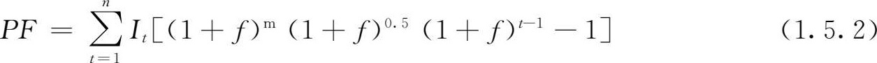 第一年涨价预备费: PF 1 = I 1 [(1+ f )(1+ f ) 0.5 -1]=191.8(万元)