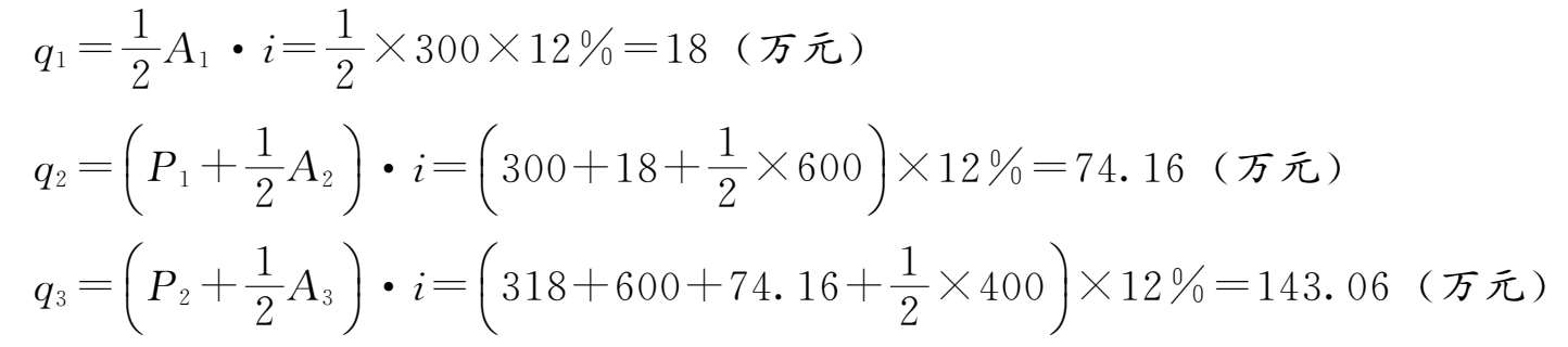 【 例1.5.2 】某新建项目,建设期为3年,分年均衡进行贷款,第一年贷款300万元,第二年贷款600万元,第三年贷款400万元,年利率为12%,建设期内利息只计息不支付,计算建设期利息。