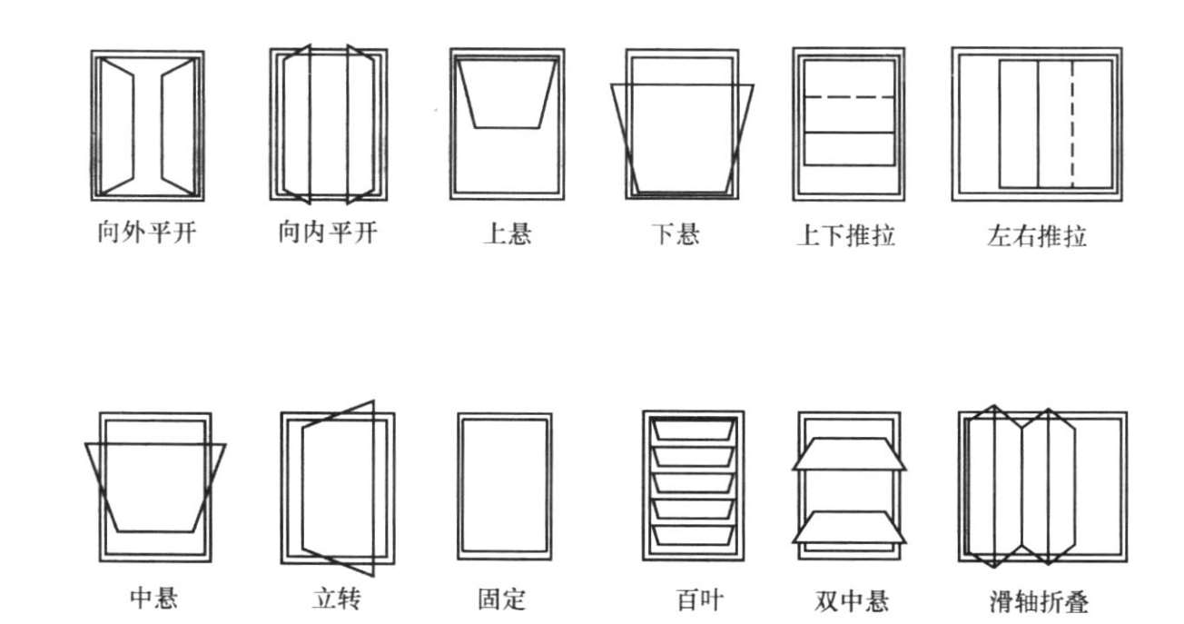 窗按所用材料不同,分为木窗、钢窗、铝合金窗、铝塑窗、塑钢窗等;按开启方式,可分为平开窗、中悬窗、上悬窗、下悬窗、立式转窗、水平推拉窗、垂直推拉窗、百叶窗、隔音保温窗、固定窗、防火窗、橱窗、防射线观察窗等,见图2-29。