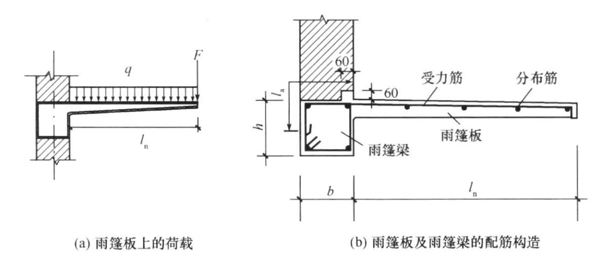 (1)雨篷板。雨篷板为一典型悬臂受弯构件。雨篷板承受的荷载除有恒载(板自重、面层、抹灰等构造层重)、均布活荷载外,还应考虑施工荷载或检修的集中荷载,见图2-34(a)。