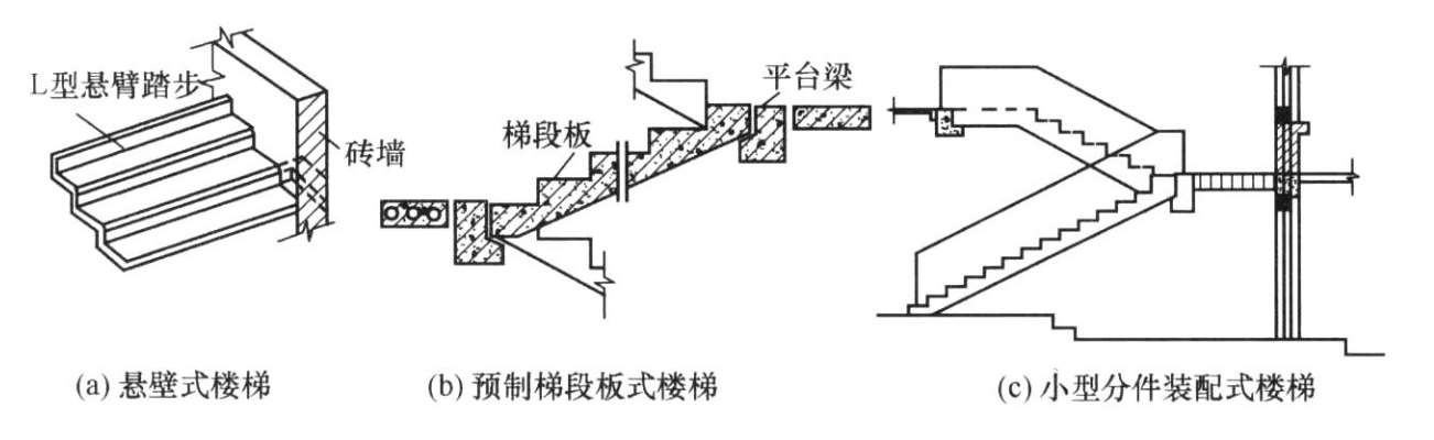 (2)装配式楼梯。由于装配式构件在工厂加工预制,现场装配,加快了施工速度,故适用于大规模住宅建设等。装配式钢筋混凝土楼梯根据建筑设计要求有各种不同结构形式,一般常用的预制装配式楼梯有悬壁式楼梯、预制梯段板式楼梯、小型分件装配式楼梯等,如图2-22所示。