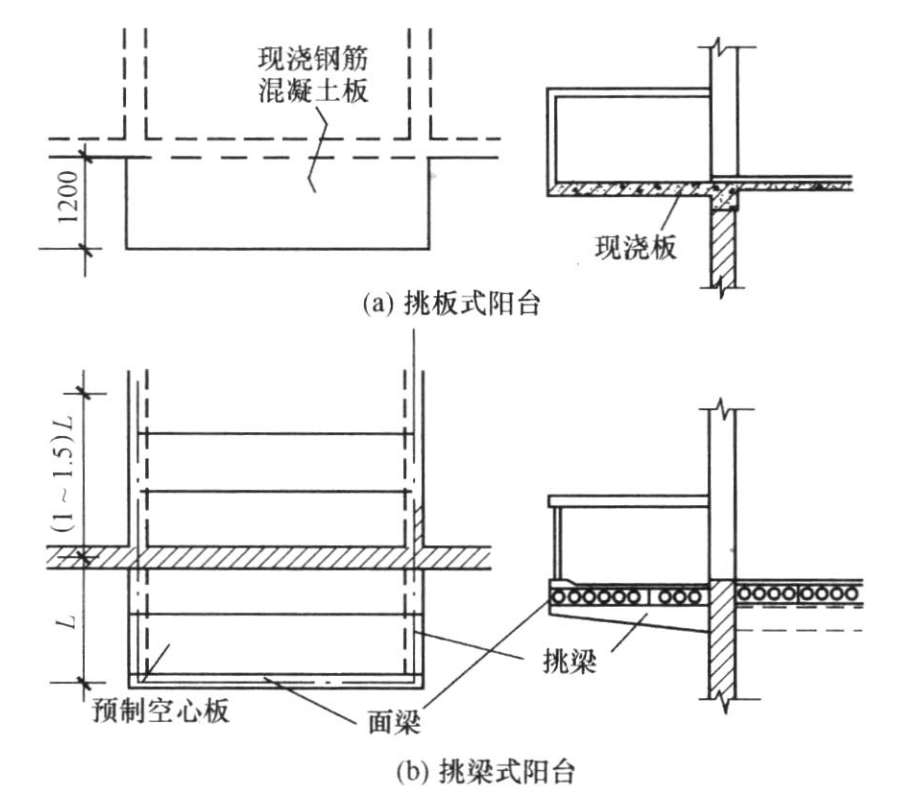 阳台结构形式有挑板式阳台和挑梁式阳台两种,见图2-33。