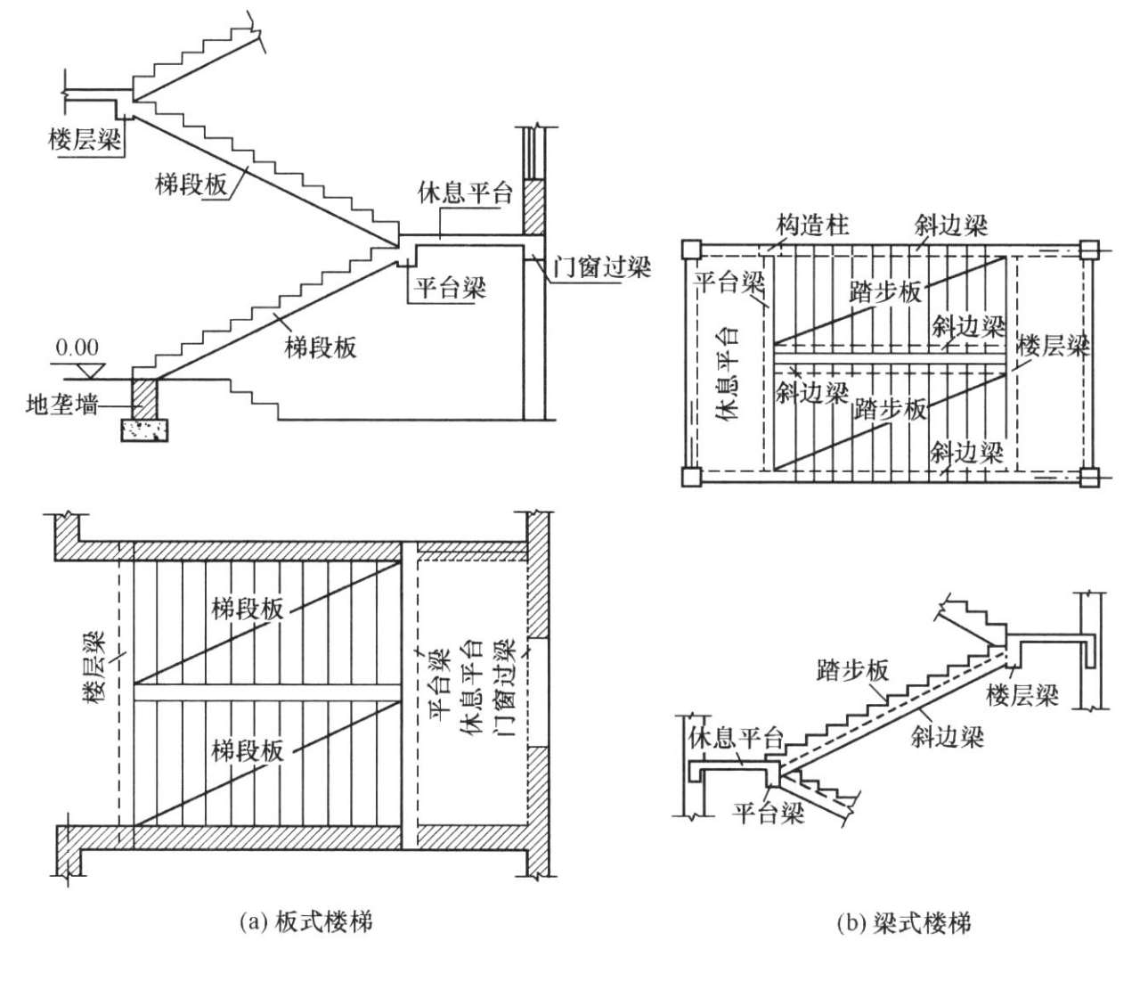 (1)板式楼梯。图2-20(a)为板式楼梯。板式楼梯由梯段板、平台板和平台梁组成,一般用作跨度不超过3m的小跨度楼梯较为经济。板式楼梯的下表面平整,施工支模方便,外形完整、轻巧美观,故而目前跨度较大的公共建筑楼梯也常采用这种楼梯形式。板式楼梯的缺点是斜板较厚,当跨度较大时,材料用量较多。