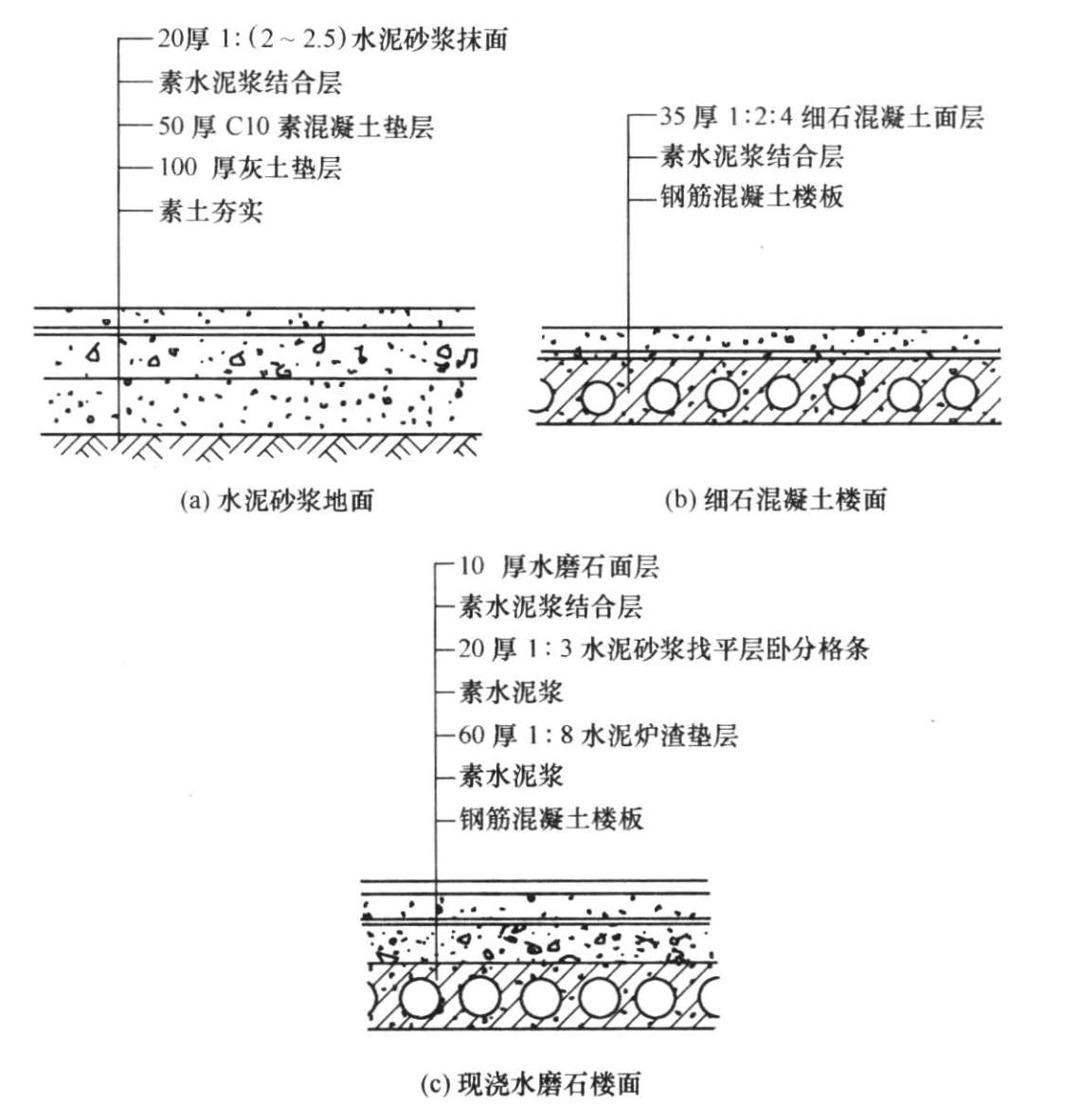 (1)整体地面包括水泥砂浆地面、混凝土地面和现浇水磨石地面,图2-31是它们的典型构造简图。