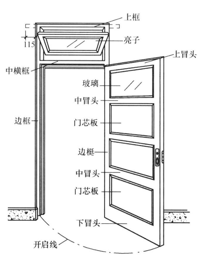 门是由门框、门扇、亮子、玻璃及五金零件等部分组成。亮子又称腰头窗(简称腰头、腰窗);门框又叫门樘子,由边框、上框、中横框等组成;门扇由上冒头、中冒头、下冒头、边梃、门芯板等组成;五金零件包括铰链、插销、门锁、风钩、拉手等。图2-27是木门的构造简图。