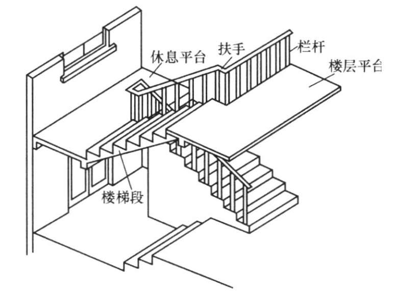 楼梯是房屋各楼层间的垂直交通设施。常见的楼梯有木楼梯、钢筋混凝土楼梯和钢楼梯等,一般采用单跑楼梯、双跑楼梯、三跑楼梯和圆形楼梯等,其中钢筋混凝土楼梯及双跑式楼梯应用最广。楼梯由楼梯段、平台、栏杆(或栏板)和扶手三部分组成,图2-19所示是双跑楼梯的组成。
