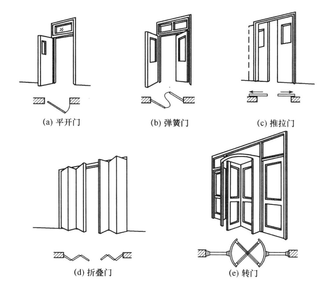 制门的材料有多种,常见的主要有木门、钢门、铝合金门、铝塑门、塑钢门等;按门的开启形式,可分为平开门、弹簧门、折叠门、转门、卷帘门等,见图2-28;按门的用料和构造,可分为镶板门、夹板门、玻璃门、纱门、百叶门等。此外,还有一些特殊要求的门,如自动门、隔音门、保温门、防火门、防射线门等。