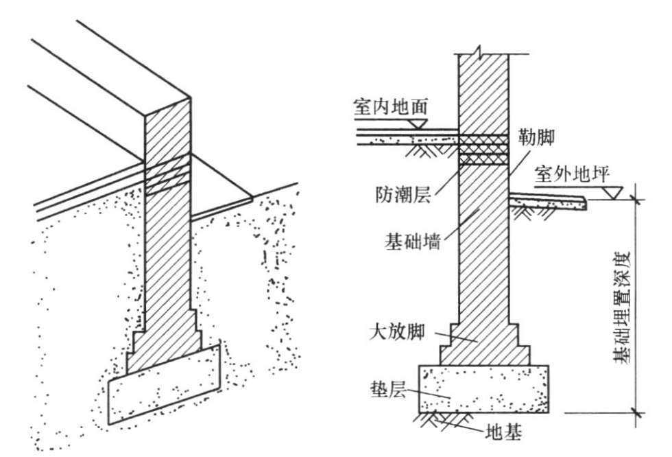 (4)基础墙。从构造上讲,大放脚顶面至防潮层为基础墙;在预算定额中的工程量计算上,一般以室内地坪±0.000为上界,上界以下为基础。