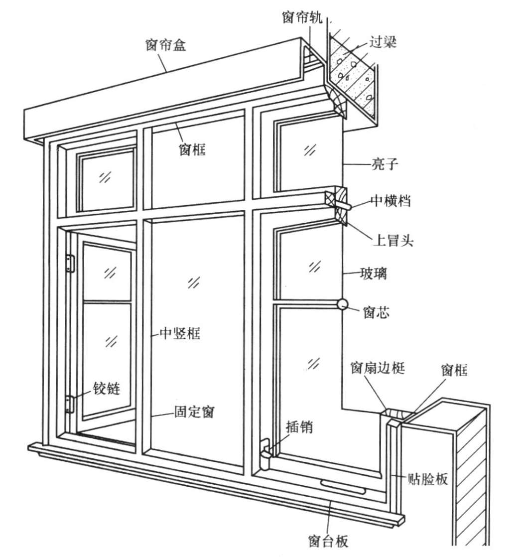 窗由窗框、窗扇和五金零件组成。窗框为固定部分,由边框、上框、下框、中横框和中竖框构成;窗扇为活动部分,由上冒头,下冒头、边梃、窗芯及玻璃构成;五金零件及附件包括铰链、风钩、插销和窗帘盒、窗台板、筒子板、贴脸板等。图2-30是平开窗的构造组成。