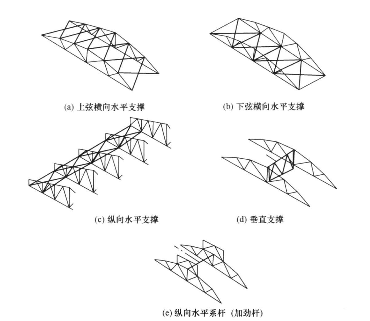 屋架支撑包括横向水平支撑(上弦或下弦横向水平支撑)、纵向水平支撑(上弦或下弦纵向水平支撑)、垂直支撑和纵向水平系杆(加劲杆)等,见图2-40。