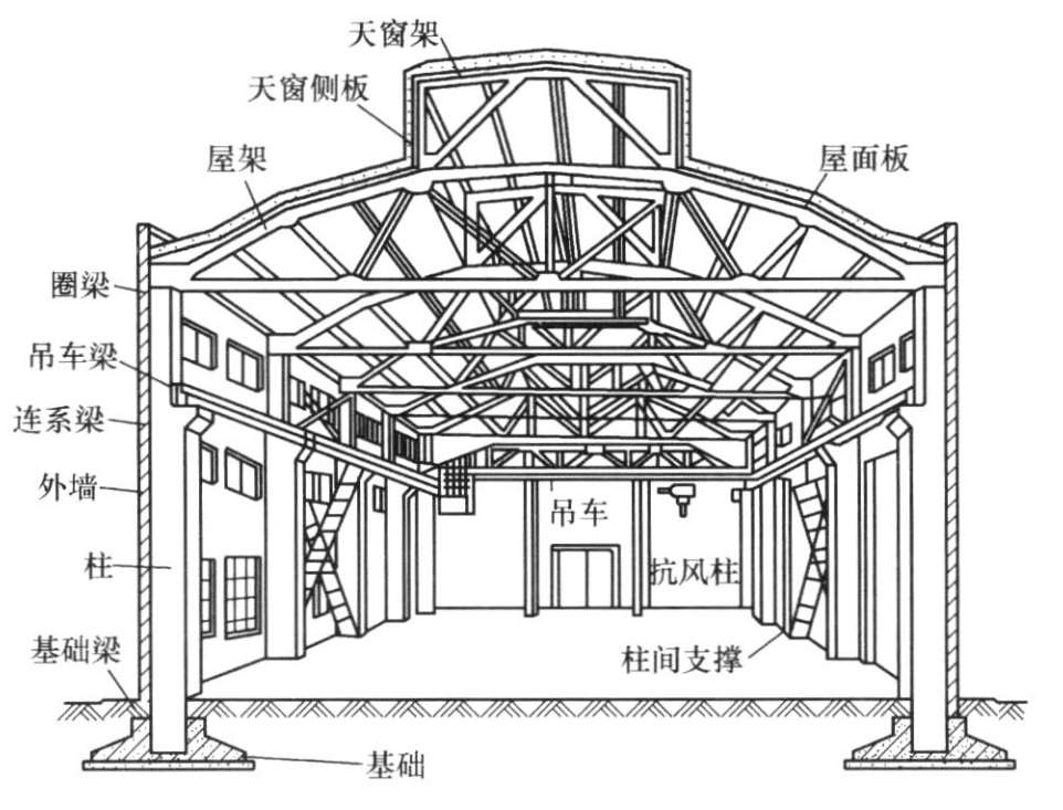 单层厂房按结构组成有两种类型:一是墙承重结构,采用砖外墙、砖柱承重;二是骨架承重结构,由钢筋混凝土或钢构件组成骨架承重,墙体只起围护和分隔作用。