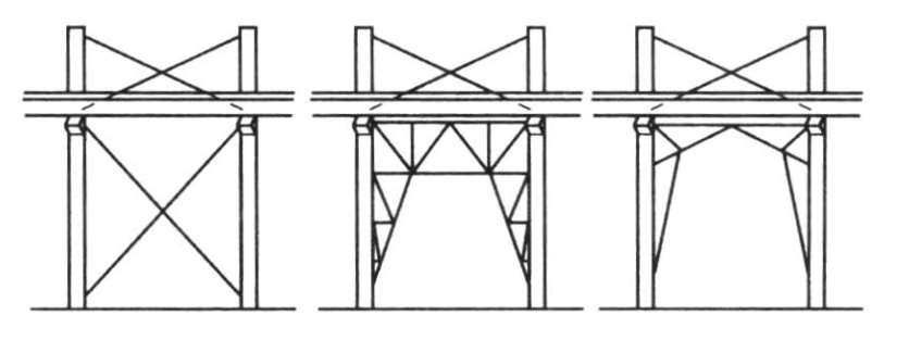柱间支撑通常设置在厂房中间一个柱间内。一般采用钢材制作,多采用交叉式。当柱间需布置设备或作通道时可采用门架式,见图2-37。
