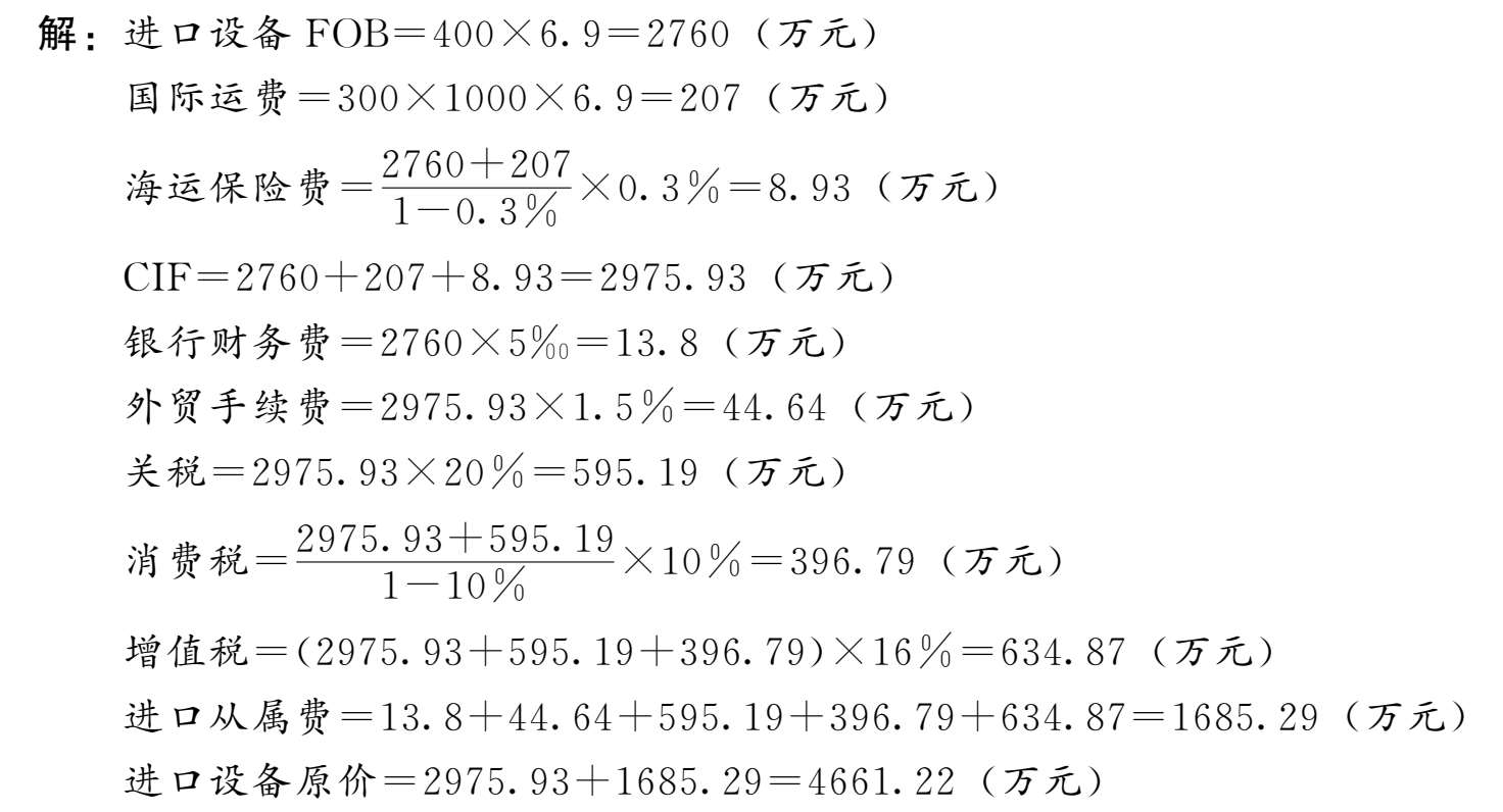 【例1.2.2】 从某国进口应纳消费税的设备,重量1000t,装运港船上交货价为400万美元,工程建设项目位于国内某省会城市。如果国际运费标准为300美元/t,海上运输保险费率为3‰,银行财务费率为5‰,外贸手续费率为1.5%,关税税率为20%,增值税的税率为16%,消费税税率10%,银行外汇牌价为1美元=6.9元人民币,对该设备的原价进行估算。