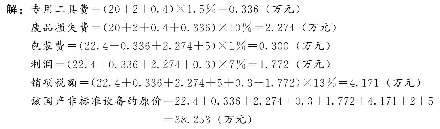 【例1.2.1】 某工厂采购一台国产非标准设备,制造厂生产该台设备所用材料费20万元,加工费2万元,辅助材料费4000元。专用工具费率1.5%,废品损失费率10%,外购配套件费5万元,包装费率1%,利润率为7%,增值税率为13%,非标准设备设计费2万元,求该国产非标准设备的原价。
