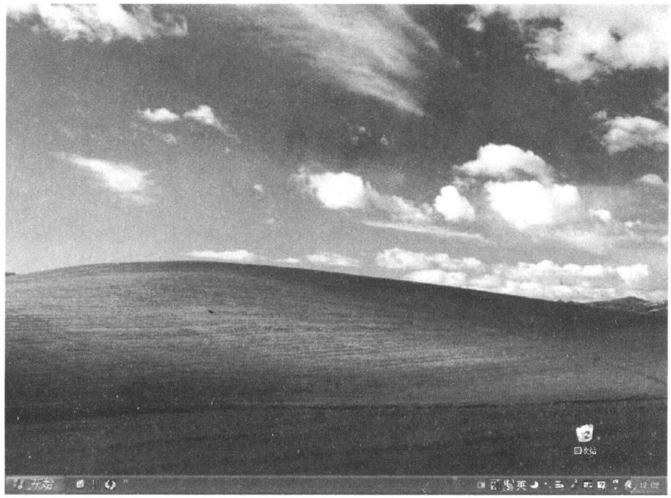 Windows XP启动时,首先出现欢迎界面,用户选择用户账户并输入口令。Windows XP启动后呈现在用户面前的是桌面。所谓桌面是指Windows XP所占据的屏幕空间,即整个屏幕背景。桌面的底部是一个任务栏,最左端是“开始”按钮,最右端是任务栏的通知区域。初始时桌面只有一个“回收站”图标,如图2-1所示,以后用户可以根据自己的喜好设置桌面,把经常使用的程序、文档和文件夹放在桌面上或在桌面上为它们建立快捷方式。