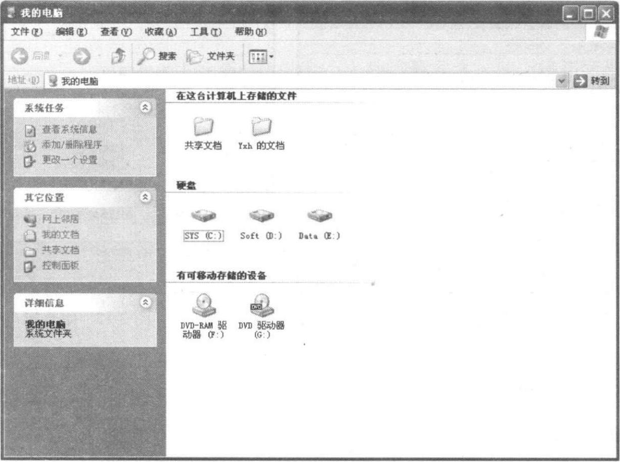 单击“开始”→“我的电脑”图标, WindowsXP将会启动“我的电脑”窗口,如图2-13所示。